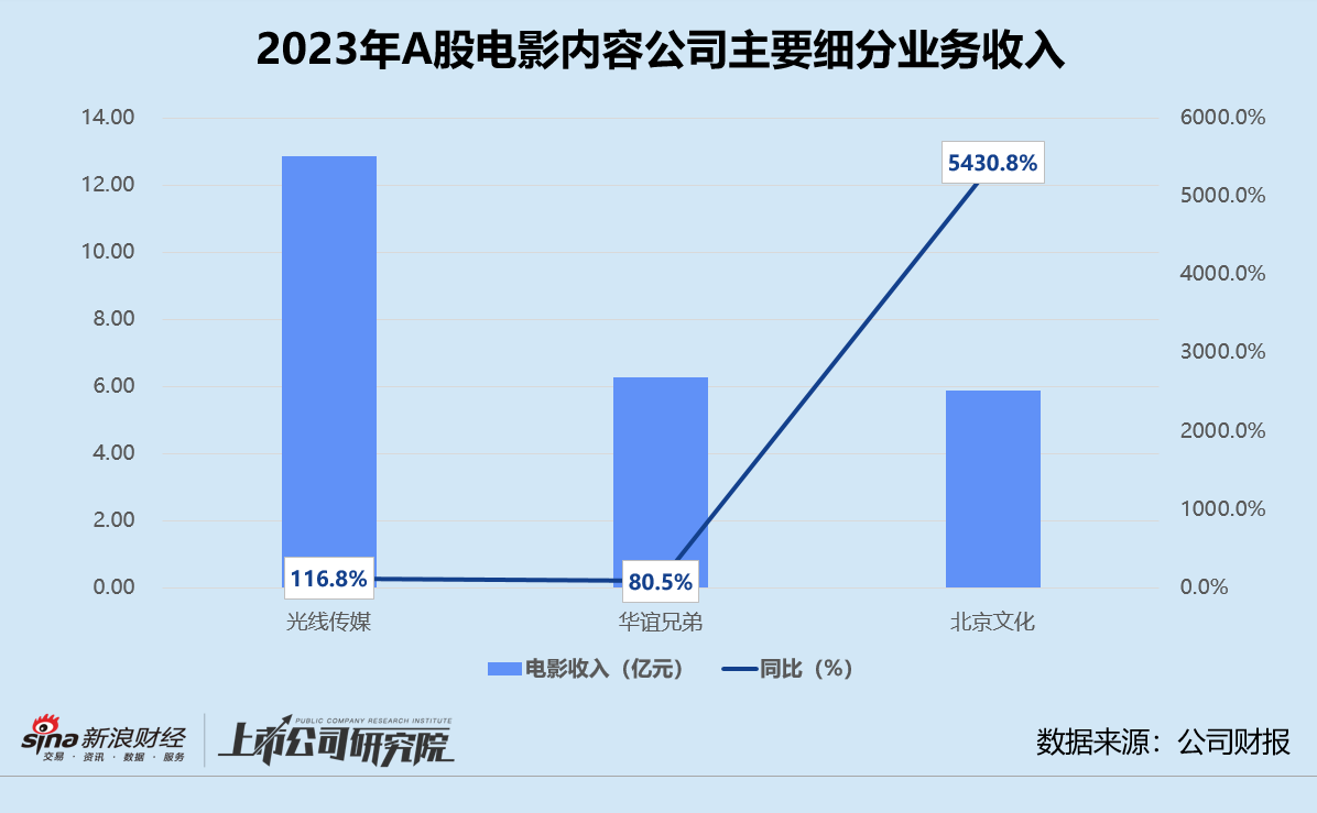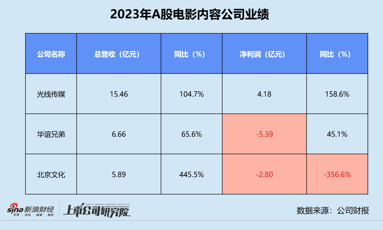 截至4月30日,A股的多家影视公司均已发布2023年业绩报告。光线传媒、华谊兄弟和北京文化(维权)3家电影内容制作公司总营收为28.01亿元,同比增长121.4%。归母净亏损合约4.01亿元,较2022年同期大幅收窄77.2%。