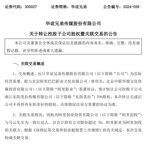 7月23日晚,华谊兄弟公告称拟与阿里影业签署协议,预计转让公司控股子公司东阳美拉70%股权,股权转让款金额为3.5亿元,本次转让完成后公司不再持有东阳美拉的股权。