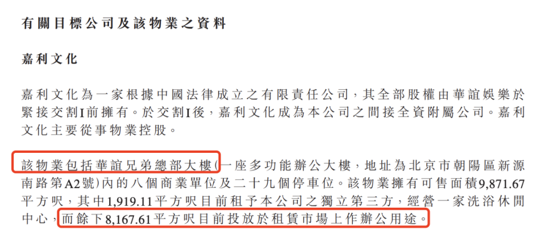 丰联广场之后,华谊兄弟的办公地是位于北京市朝阳区华谊兄弟办公大楼。2015年3月,如日中天的华谊兄弟,通过子公司以4亿元的代价,收购了北京华远嘉利房地产开发有限公司(后更名为北京华谊兄弟嘉利文化发展有限公司)。
