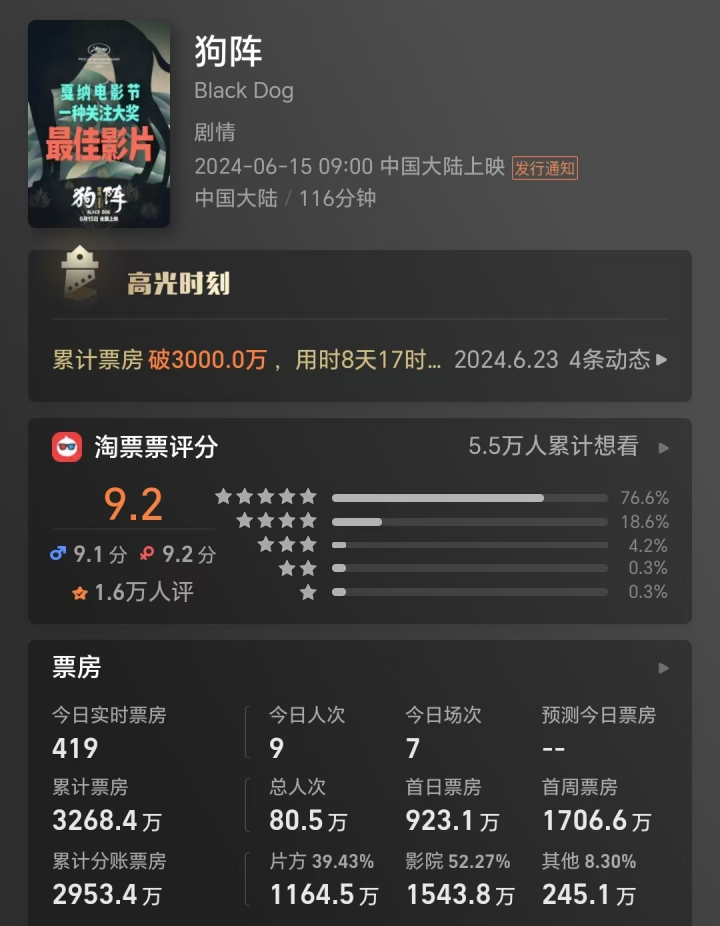 如4月20日上映的《屋顶足球》,票房只有103.5万元。6月15日上映的《狗阵》票房3268万元。6月28日上映的《来福大酒店》票房5643万元。