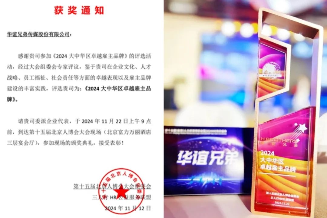 11月22日,华谊兄弟以“平等、创新、快乐、分享”的企业文化,持续打造以人为本,关注成长与发展,尊重与发挥员工价值的工作氛围,并积极承担与履行社会责任在第十五届(北京)人力资源博览会上荣获“2024大中华区卓越雇主品牌”大奖。