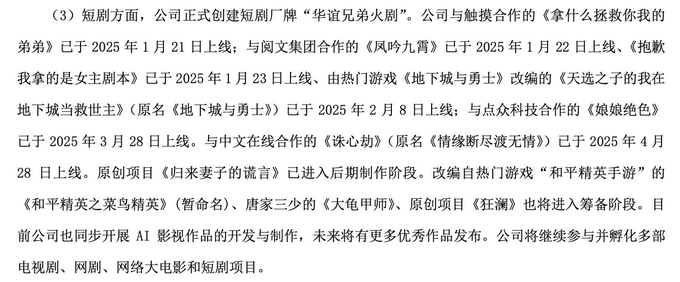 短剧方面,公司正式创建短剧厂牌“华谊兄弟火剧”。公司与触摸合作的《拿什么拯救你我的弟弟》已于2025年1月21日上线;与阅文集团合作的《凤吟九霄》已于2025年1月22日上线、《抱歉我拿的是女主剧本》已于2025年1月23日上线、由热门游戏《地下城与勇士》改编的《天选之子的我在地下城当救世主》(原名《地下城与勇士》)已于2025年2月8日上线;与点众科技合作的《娘娘绝色》已于2025年3月28日上线等。