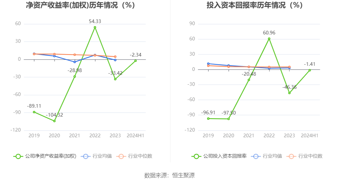 盈利能力方面, 2024年半年度公司加权平均净资产收益率为-2.34%,同比上升45.98个百分点。公司2024年上半年投入资本回报率为-1.41%,较上年同期上升54.54个百分点。