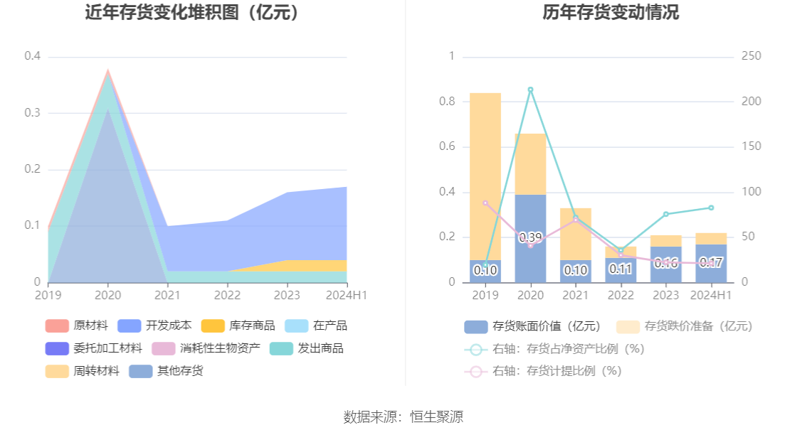 从存货变动来看,截至2024年上半年末,公司存货账面价值为1737.38万元,占净资产的82.98%,较上年末增加110.64万元。其中,存货跌价准备为471.59万元,计提比例为21.35%。
