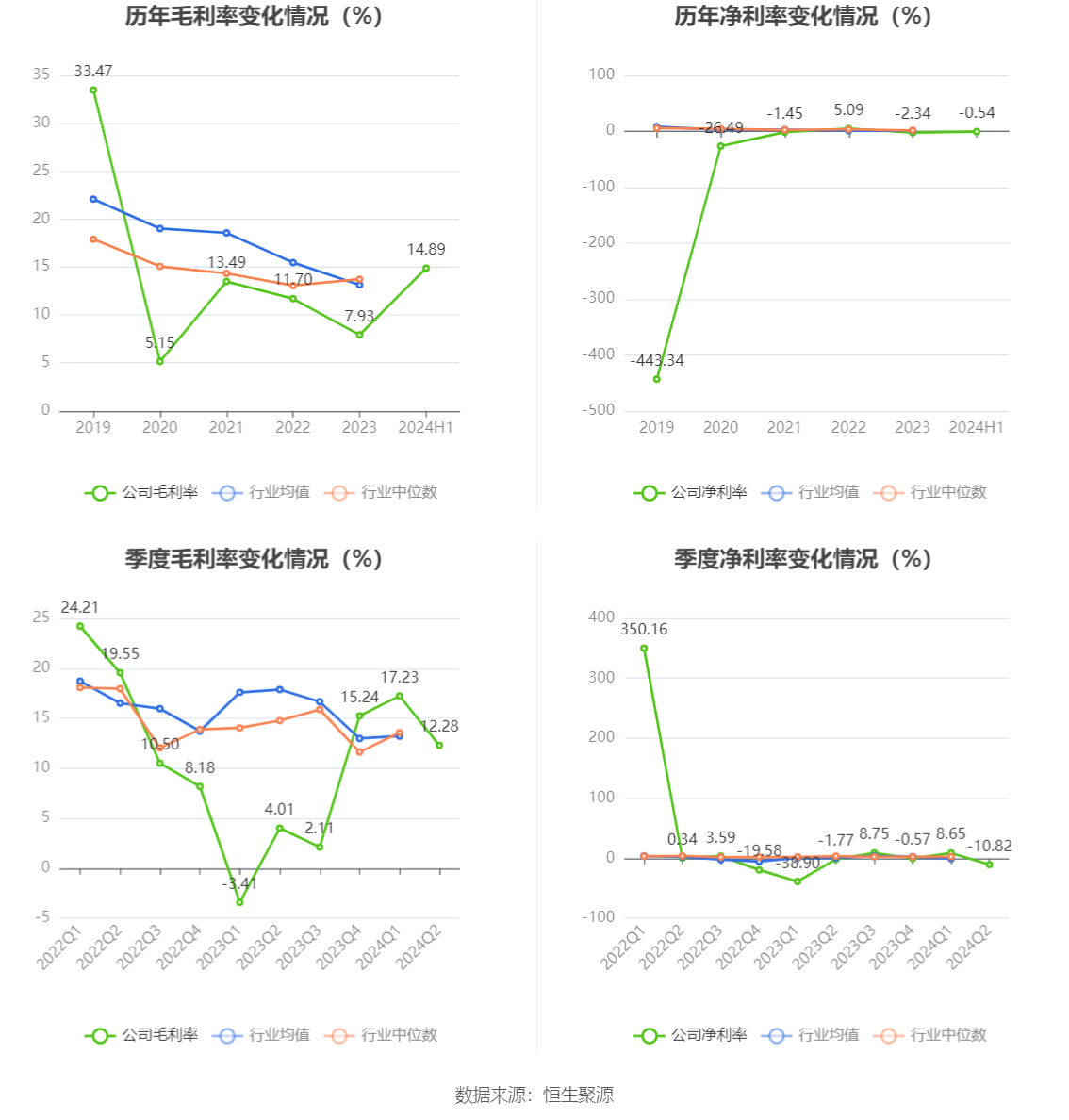2024年上半年,公司毛利率为14.89%,同比上升11.89个百分点;净利率为-0.54%,较上年同期上升6.26个百分点。从单季度指标来看,2024年第二季度公司毛利率为12.28%,同比上升8.27个百分点,环比下降4.95个百分点;净利率为-10.82%,较上年同期下降9.05个百分点,较上一季度下降19.47个百分点。