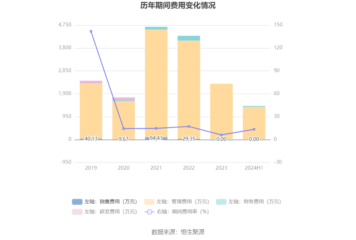 2024年上半年,公司期间费用为1395.02万元,较上年同期增加162.38万元;期间费用率为13.48%,较上年同期上升6.31个百分点。其中,管理费用同比增长13.13%,财务费用同比增长14.85%。