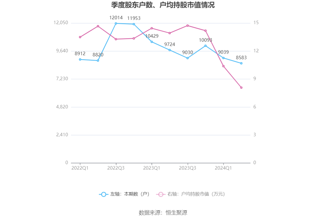 筹码集中度方面,截至2024年上半年末,公司股东总户数为8583户,较一季度末下降了456户,降幅5.04%;户均持股市值由一季度末的10.38万元下降至8.08万元,降幅为22.16%。