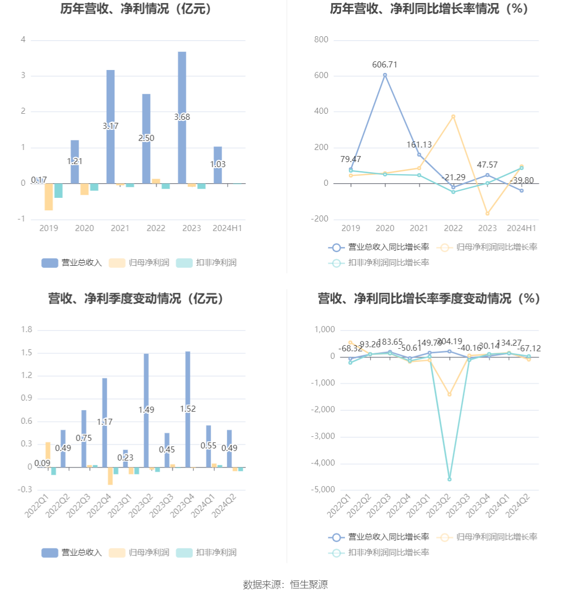 ST天龙(300029)8月27日披露2024年半年度报告。2024年上半年,公司实现营业收入1.03亿元,同比下降39.80%;归母净利润亏损49.47万元,上年同期亏损1162.34万元;扣非净利润亏损197.57万元,上年同期亏损1482.45万元;经营活动产生的现金流量净额为-1850.99万元,上年同期为-558.35万元;报告期内,ST天龙基本每股收益为-0.0025元,加权平均净资产收益率为-2.34%。