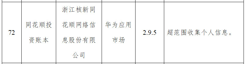 由浙江核新同花顺网络信息股份有限公司开发的同花顺投资账本(版本号:2.9.5),应用来源为华为应用市场,所涉问题为超范围收集个人信息。