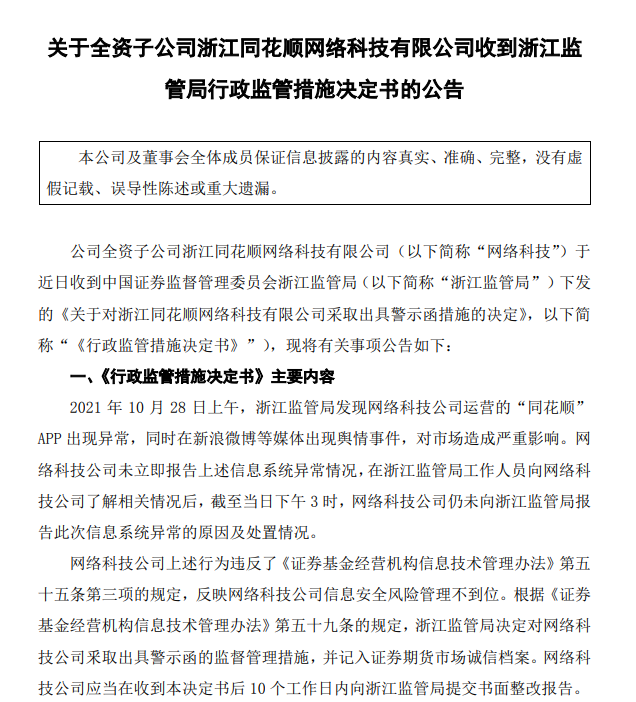 公告显示,当日上午,浙江监管局发现“同花顺”APP出现异常,同时在网络上出现舆情事件,对市场造成严重影响。同花顺网络科技公司未立即报告上述信息系统异常情况,在浙江监管局工作人员向网络科技公司了解相关情况后,截至当日下午3时,网络科技公司仍未向浙江监管局报告此次信息系统异常的原因及处置情况。浙江监管局决定对网络科技公司釆取出具警示函的监督管理措施,并记入证券期货市场诚信档案。