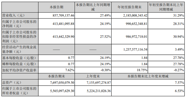 据刚刚发布的财报显示,今年前三季度,同花顺实现营业收入21.85亿元,同比增长31.29%;归属于上市公司股东的净利润9.91亿元,同比增长28.31%;基本每股收益1.84元。其中,第三季度实现归属于上市公司股东的净利润4.13亿元,同比增长24.19%。