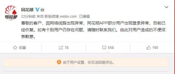 距离开盘过去1小时15分后,同花顺官方微博表示,“因网络线路出现异常,同花顺APP部分用户出现登录异常,目前已经恢复。如有个别用户仍存在问题,请随时联系我们。由此对用户造成的不便深表歉意。”