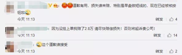 由于同花顺微博已关闭评论,有网友在转发时表示,“因为没挂上单我赔了2.8万,请尽快赔偿损失!否则将起诉贵公司!”网友中提到“退钱”“赔偿损失”的网友不少。