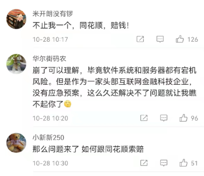 尽管在上午收盘前,同花顺系统已经恢复并道歉,但网友仍不买账,纷纷喊着要同花顺赔钱。“赔钱”“可以索赔吗?早盘拉高的票卖不出去,这会被闷下来了”“如何向同花顺索赔”……