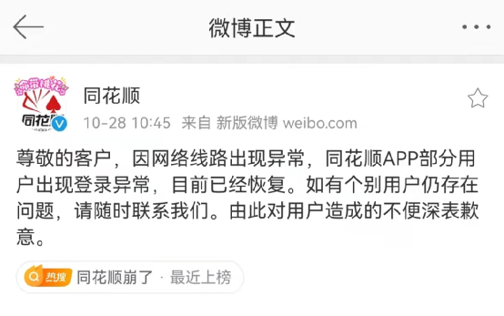 直到上午10点50分,针对系统崩溃,同花顺在官方微博回应表示,因网络线路出现异常,同花顺APP部分用户出现登录异常,目前已经恢复。如有个别用户仍存在问题,请随时联系我们。由此对用户造成的不便深表歉意。
