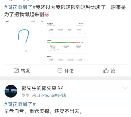 淘县“南园一哥”兄表示:“本来早盘是可以挣钱走的,结果同花顺登录不上,等好了的时候已经跌停了。被收割一个跌停。没被市场打败,被同花顺收割了。”