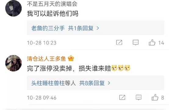 有网友表示,“早盘血亏,你还不让我跑!”“本来小亏,这下卡的动不了,现在大亏了”……“我还以为是我手机问题,来回走了好几趟找信号”……
