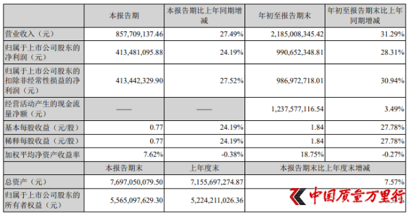 据刚刚发布的财报显示,今年前三季度,同花顺实现营业收入21.85亿元,同比增长31.29%;归属于上市公司股东的净利润9.91亿元,同比增长28.31%;基本每股收益1.84元。其中,第三季度实现归属于上市公司股东的净利润4.13亿元,同比增长24.19%。
