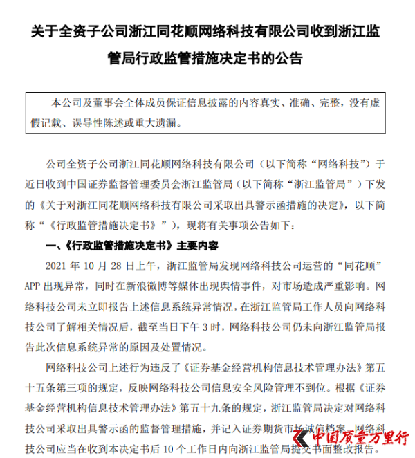 公告显示,当日上午,浙江监管局发现“同花顺”APP出现异常,同时在网络上出现舆情事件,对市场造成严重影响。同花顺网络科技公司未立即报告上述信息系统异常情况,在浙江监管局工作人员向网络科技公司了解相关情况后,截至当日下午3时,网络科技公司仍未向浙江监管局报告此次信息系统异常的原因及处置情况。浙江监管局决定对网络科技公司釆取出具警示函的监督管理措施,并记入证券期货市场诚信档案。