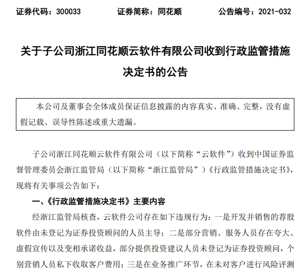12月28日晚间,同花顺发布公告称,经浙江证监局核查,子公司浙江同花顺云软件有限公司(以下简称“云软件公司”)因五方面违规行为,收到《行政监管措施决定书》。