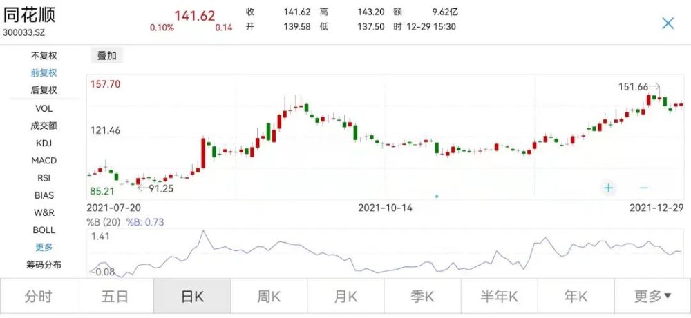 12月29日,同花顺报收141.62元/股,涨0.1%,总市值761亿元。