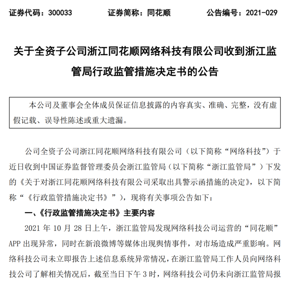 同花顺发布公告称,10月28日上午,浙江证监局发现网络科技公司运营的“同花顺”App出现异常,同时在微博等媒体出现舆情事件,对市场造成严重影响。该网络科技公司未立即报告上述信息系统异常情况,在浙江证监局工作人员向网络科技公司了解相关情况后,截至当日下午3时,仍未向浙江证监局报告此次信息系统异常的原因及处置情况。