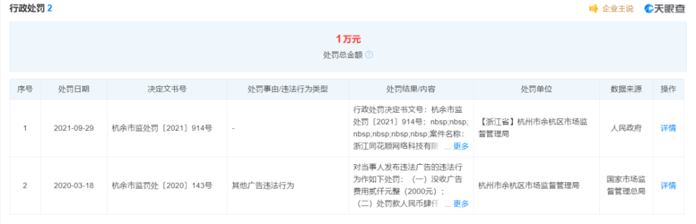 据资料显示,网络科技公司曾遭次行政处罚。2020年3月因涉及广告违法行为,杭州市余杭区市监局对网络科技没收广告费2000元整,并处罚款4000元。2021年9月网络科技公司运用的同花顺手机炒股App内发布的两篇广告推文,涉嫌投资基金广告中对证券投资业绩进行预测,承诺收益或承担损失。最终,余杭区市监局对推文1罚款6000元,推文2罚款4000元,共计1万元罚款上缴国库。