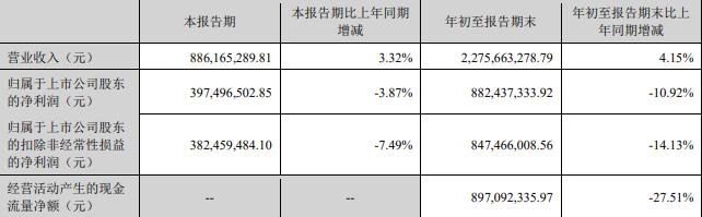 前三季度,公司营业收入实现22.76亿元,同比增长4.15%;归属于上市公司股东的净利润8.82亿元,同比减少10.92%;归属于上市公司股东的扣除非经常性损益的净利润8.47亿元,同比减少14.13%;经营活动产生的现金流量净额8.97亿元,同比减少27.51%。