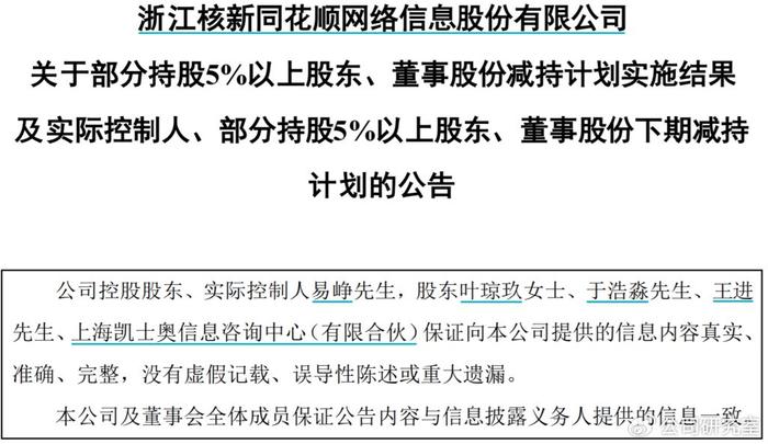 3月28日凌晨,同花顺抛出的一份减持公告称,实控人、董事长易峥、董事叶琼玖,凯士奥、于浩淼、王进拟自公告发布之日起15个交易日后的六个月内,以集中竞价交易方式或大宗交易方式合计减持公司股份不超过4550万股(占同花顺总股本的8.46%)。