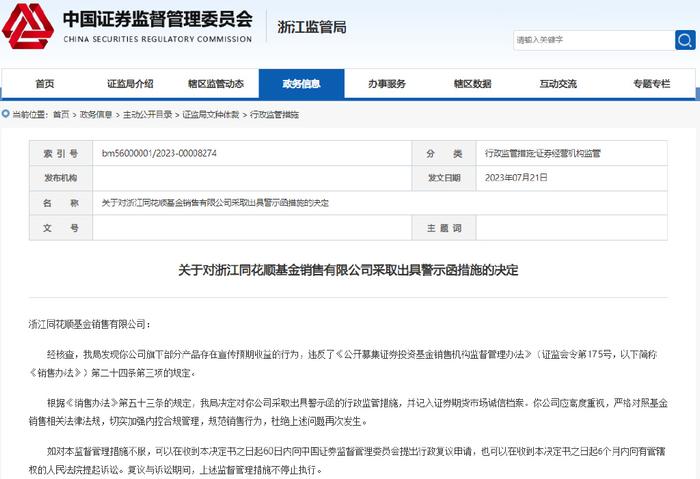 7月21日,浙江证监局表示,经核查,同花顺基金销售旗下部分产品存在宣传预期收益的行为,违反了《公开募集证券投资基金销售机构监督管理办法》第二十四条第三项的规定,故决定对该公司采取出具警示函的行政监管措施,并记入证券期货市场诚信档案。