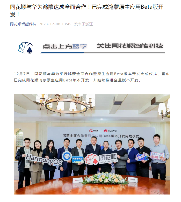 同花顺与华为鸿蒙达成全面合作,已完成鸿蒙原生应用Beta版开发