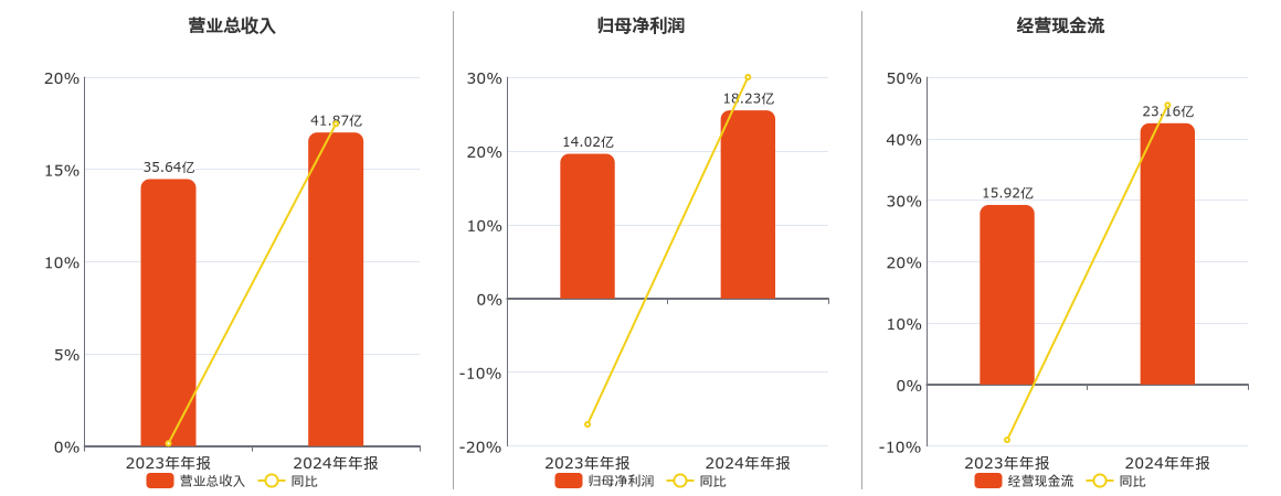 公司营业总收入为41.87亿元,较去年同报告期营业总收入增加6.23亿元,实现5年连续上涨,同比较去年同期上涨17.47%。归母净利润为18.23亿元,较去年同报告期归母净利润增加4.21亿元,同比较去年同期上涨30.00%。经营活动现金净流入为23.16亿元,较去年同报告期经营活动现金净流入增加7.24亿元,同比较去年同期上涨45.46%。