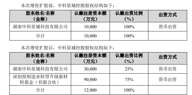 中科电气(300035)公告,深创投新材料基金拟以人民币9亿元认购中科星城控股新增注册资本9亿元,同时中科星城控股的股东中科星城科技拟以人民币2亿元认购中科星城控股新增注册资本2亿元,本次增资完成后,中科星城控股注册资本为人民币12亿元。