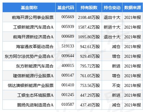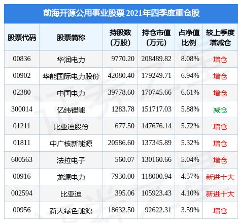 根据2021年报基金重仓股数据,重仓该股的基金共254家,其中持有数量最多的基金为前海开源公用事业股票。前海开源公用事业股票目前规模为258.16亿元,最新净值2.963(3月22日),较上一日上涨0.86%,近一年上涨99.14%。该基金现任基金经理为崔宸龙。崔宸龙在任的公募基金包括:前海开源沪港深非周期股票A,管理时间为2020年7月20日至今,期间收益率为-19.1%;前海开源新经济混合A,管理时间为2020年10月27日至今,期间收益率为115.13%;前海开源沪港深智慧生活混合,管理时间为2021年6月24日至今,期间收益率为-27.29%。