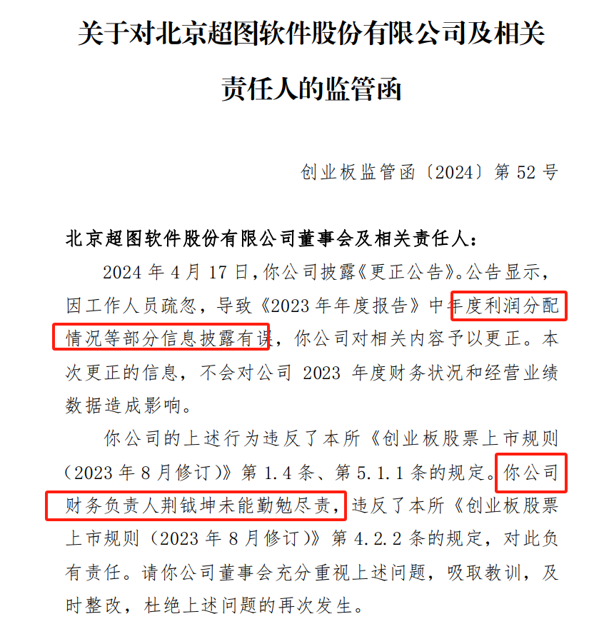 超图软件因年度利润分配情况等部分信息披露有误收监管函