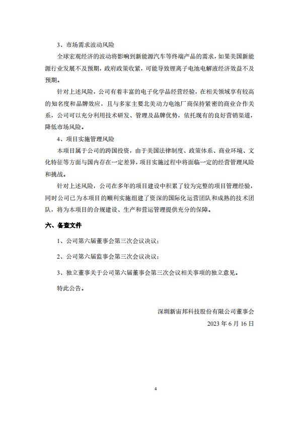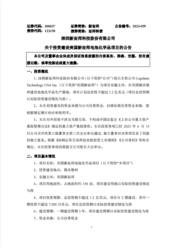 6月15日晚间,深圳新宙邦科技股份有限公司(下称“新宙邦”)发布公告称,拟以全资公司Capchem Technology USA Inc.为项目实施主体,在美国俄亥俄州建设电池化学品生产基地,项目计划总投资不超过1.2亿美元。