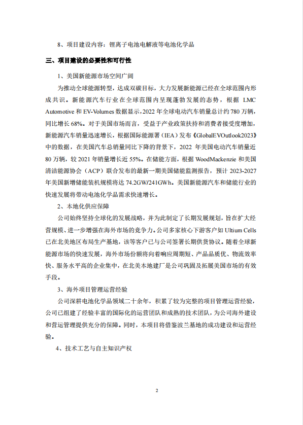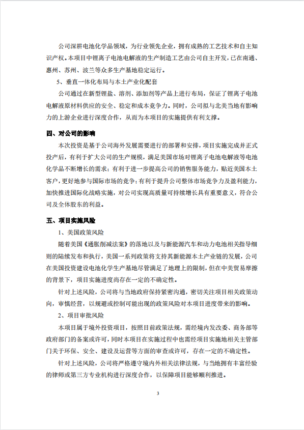 根据公告,上述项目占地面积约150亩,项目分两期建设,项目建设内容为锂离子电池电解液等电池化学品。