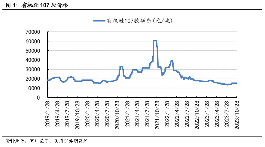 展望四季度,有机硅107胶价格有企稳回升态势,据百川盈孚,截?2023年 10? 28?,有机硅 107胶华东区域均价 15300元/吨,较 8?低点 13500 元/吨反弹 13.33%,考虑到原材料约?个?的库存周期,盈利情况或有所修复。