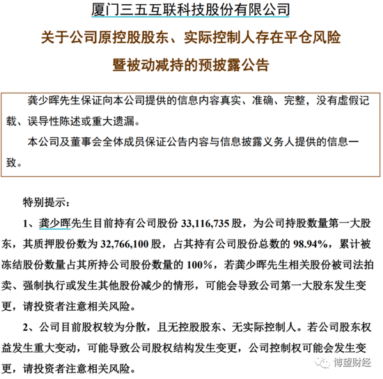 7月25日,三五互联(300051.SZ)发布了一则公告,原控股股东、实际控制人龚少晖因个人债务已发生逾期,其持有的公司股票可能存在因强制平仓、司法拍卖被动减持的风险。
