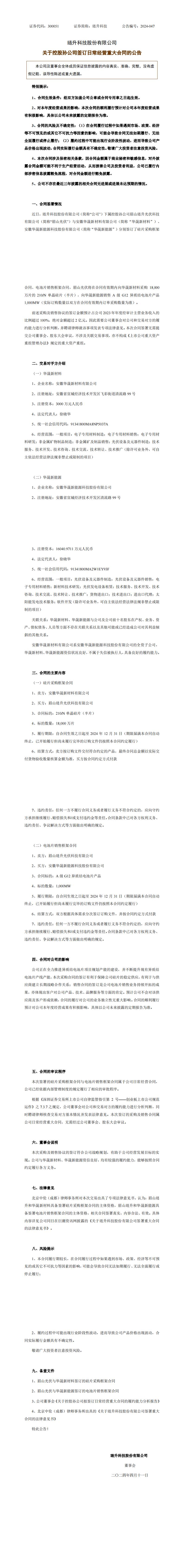 国际能源网获悉,4月11日,琏升科技发布公告,下属控股孙公司眉山琏升光伏科技有限公司(简称“眉山光伏”)与华晟新材料、华晟新能源分别签订了硅片采购框架合同、电池片销售框架合同。眉山光伏将在合同有效期内向华晟新材料采购1.8亿片的210/N单晶硅片(半片),向华晟新能源销售A级G12异质结电池片产品1000MW。前述采购及销售协议的签订金额预计占公司2023年年度经审计主营业务收入的比例超过100%,绝对金额超过2亿元。