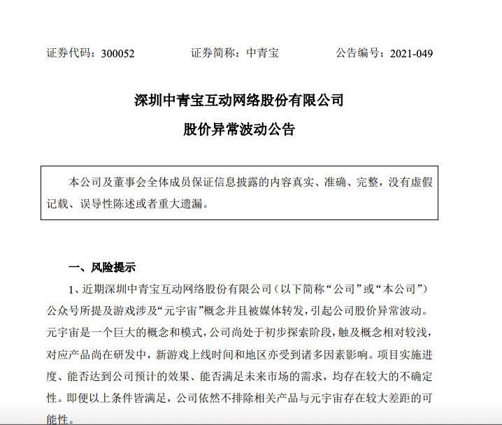 近日,随着元宇宙概念的火热,自9月9日到9月13日连续三个交易日,中青宝收盘价格涨幅偏离值累计超过30%,属于股票交易异常波动的情况,随即中青宝于今日发布股价异常波动公告。