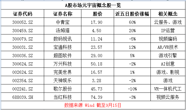 除中青宝股价继续上涨外,汤姆猫9月14日报收4.57元/股,较前一交易日下跌超过8%。此外,宝通科技、完美世界(002624.SZ)等元宇宙概念股在9月14日也有不同程度的下滑。到了9月15日,以中青宝为首的元宇宙概念股股价均出现了不同程度的下滑。如上表所示,大多数公司最近五日的涨幅不足10%,甚至为负。