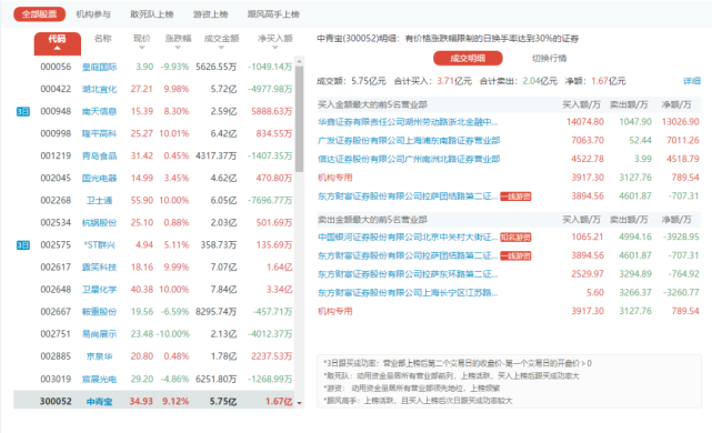 据雷达财经统计,自2021年9月至11月9日,中青宝已有12个交易日登上龙虎榜,上榜类型包括:连续3个交易日内收盘价格涨幅较基准指标偏离值累计达到30%、有价格涨跌幅限制的日换手率达到30%、有价格涨跌幅限制的日收盘价格涨跌幅达到15%。