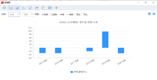 中青宝扩展云服务业务的背后是,公司游戏业务营收的逐年下降。从2015年起,中青宝手机游戏的营业收入出现了连续四年的下滑。2019年公司手机游戏业务营收同比增长96.07%,次年,同比增长率再次变为负值。