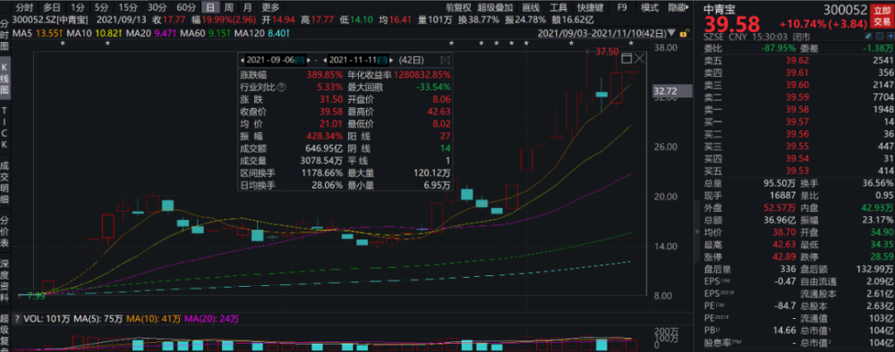 需要注意的是,自今年9月6日中青宝在其官方微信公众号上宣布研发元宇宙游戏《酿酒大师》后,其股价便从8.20元每股上涨至今日的39.58元每股,股价最高涨幅超4倍,市值已超百亿元。