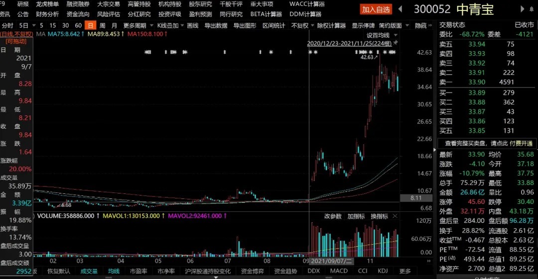 不过,此前,中青宝在回复关注函中警示,截至2021年11月10日,中青宝收盘价(35.74元/股,编者注)市盈率为520.23,远远高于同行业上市公司市盈率平均水平。请广大投资者理性投资,注意投资风险!