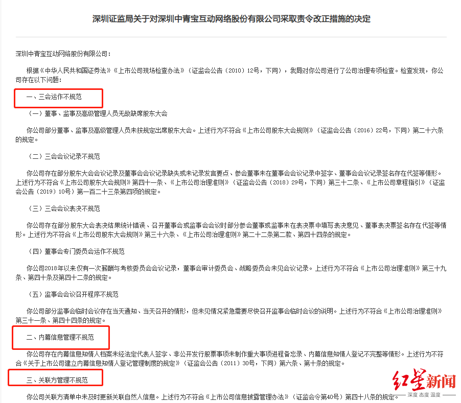 深圳证监局指出,上述问题反映出中青宝在三会运作、内幕信息知情人管理、关联方管理等方面存在不规范情形,决定对其采取责令改正的监管措施,并于收到决定书之日起30日内提交书面整改报告。