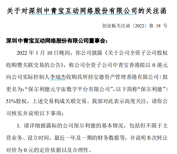 中青宝此次0元收购也引发深交所关注。1月11日午间,深交所火速向公司下发了关注函。