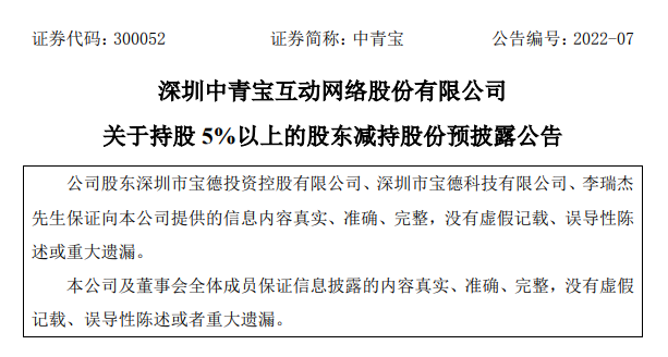 公告显示,中青宝控股股东深圳市宝德投资控股有限公司、控股股东深圳市宝德科技有限公司、实控人李瑞杰计划自公告日起15个交易日后的3个月内,减持不超过公司股份总数的3%。