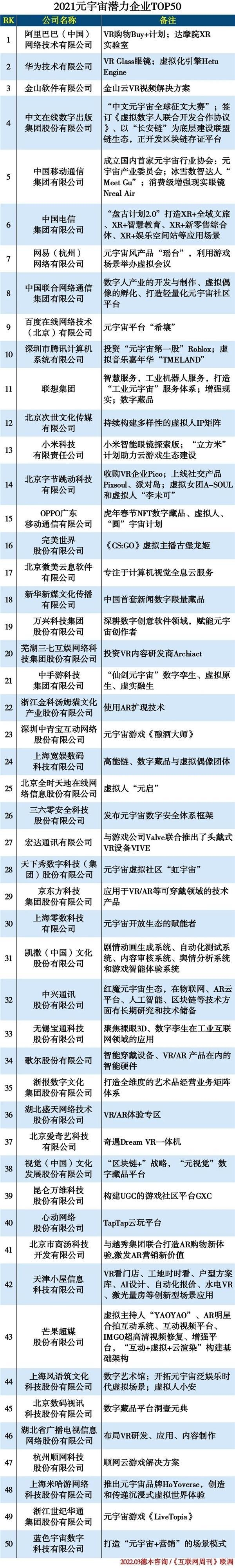 据悉,“2021元宇宙潜力企业TOP50”榜单是由《互联网周刊》联合德本咨询发布的,榜单聚焦最火热的元宇宙领域,在本期榜企业含括阿里巴巴、华为、腾讯、网易、中国移动和中国电信等国内诸多头部科技企业和互联网企业,综合展示当下元宇宙实际行动力和未来发展力方面的情况,既着眼于硬件“入口”,也重视软件、应用层面的数字创新,期待元宇宙真正为企业发展带来灵感、新思路和笃行的力量,把需求一步步落实。